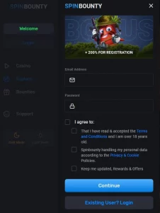 Al registrarse en Spin Bounty Casino, sólo hay que seguir unos pocos pasos. En primer lugar, introduzca sus datos personales en el formulario de inscripción. Una vez cumplimentado el formulario de inscripción, deberá verificar su cuenta. Para ello, recibirá un enlace de confirmación por correo electrónico. Simplemente haga clic en este enlace para verificar su dirección de correo electrónico. Después de este proceso de confirmación, puedes empezar a jugar.